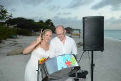Wir haben uns entschlossen ,den gesamten Text der Beiden zu veröffentlichen, weil die Schilderung wunderbar widerspiegelt, wie wir den Hochzeitsablauf gestalten: „Auch wir haben uns am romantischen Eagle-Beach das Ja-Wort gegeben. Für uns war schon lange klar, dass wir eine ganz besondere und individuell gestaltete Hochzeit haben wollten. Ungefähr ein Jahr vor unserem großen Tag gingen wir auf die Suche nach dem richtigen Land. Schnell fiel die Wahl auf Aruba: Hier gibt es rund um‘s Jahr traumhaftes Wetter, türkisfarbenes Meer und weiße Sandstrände. Wir recherchierten im Internet, welche Formalitäten wichtig sind und fanden auf Anhieb Frau Morozows Homepage. Präzise und übersichtlich war dort dargestellt, wie die Formalitäten ablaufen müssen. Gelesen - getan: Schnell nahmen wir Kontakt per Mail und dann auch per Telefon mit Rita auf, die uns freundlich, schnell und kompetent informierte. Stets stand sie mit Rat und Tat zur Seite. An unserem Hochzeitstag lief dann alles wie geschmiert! Die Frisörin Marietta war pünktlich im Hotel und zauberte Bettinas Traumfrisur und Make- up. Ritas Mann Rensley fuhr anschließend mit dem liebevoll geschmückten Hochzeitsauto vor unserem Hotel vor und brachte uns in das sehr schöne Standesamt in Aruba. Der Trausaal ist wirklich sehr prachtvoll. Nachdem diese Trauung bereits kein Auge trocken ließ, folgte ein Fotoshooting mit unserer professionellen Fotografin Sabine. An verschiedenen Orten mit abgewandelten Outfits schoss Sabine sehr viele schöne Fotos, die wir uns seitdem fast jeden Tag anschauen. Wir hatten beim Fotoshooting großen Spaß! Und dann ging es los - ab zum Eagle-Beach. Als wir am weißen Strand bei den berühmten Divi-Bäumen angekommen waren, waren wir von der Kulisse überwältigt. Rita hatte alle unsere Wünsche erfüllt und unsere Erwartungen übertroffen. Nicht nur, dass unsere Hochzeitsplüsch-Schafe und unser besonderes Ringkissen auch hier an Ort und Stelle waren. Auch war "unser" Hochzeits-Baum wunderschön in unseren Wunsch-Farben romantisch geschmückt. Lichterfackeln zeigten uns den Weg zum liebevoll dekorierten Hochzeitstisch. Dort wartete auch schon unsere freie Predigerin Bettina, die mit sehr ergreifenden Worten Gänsehautatmosphäre verbreitete. Während des Einzugs und nach der Zeremonie spielte der Steelpan-Player Charles "unsere" Lieder. Wir waren während des ganzen Tages unendlich gerührt und ergriffen. Während dann die Sonne unterging, ließen wir unseren Gefühlen freien Lauf ... Vielen Dank an Rita, Rensley, Sabine, Charles, Marietta und Bettina für diesen für uns unvergesslichen Tag! Wir schauen uns noch fast jeden Tag die Bilder an und versetzen uns zurück an diese wunderschönen Orte. Das ist wirklich ein perfekter Start in eine Ehe! Rita, du hast alles perfekt organisiert, sodass wir sorgenfrei und entspannt heiraten konnten! Vielen Dank dafür. Rensley, dir auch ein Extra-Dankeschön für deine spannende Tour durch deine Heimat! Wir haben viel gelernt und gesehen! Eure Bettina & Lars